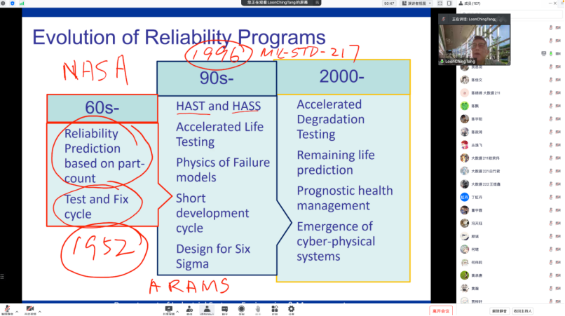 董润桢教授首先向大家介绍了可靠性工程的发展历史。随后,他结合自己过去30年来在可靠性工程领域开展的实际工作,深入浅出的阐明了产品加速退化建模、寿命预测与实验设计等理论与方法。