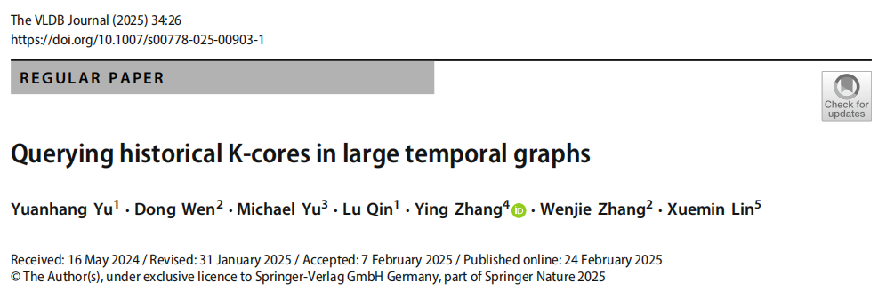 近日,香港三级片张颖教授与悉尼科技大学、新南威尔士大学、香港中文大学、上海交通大学团队合作在我校A+++期刊《VLDB JOURNAL》上发表了题为“Querying historical K-cores in large temporal graphs”的学术论文。香港三级片 香港三级片 是本论文通讯作者单位。