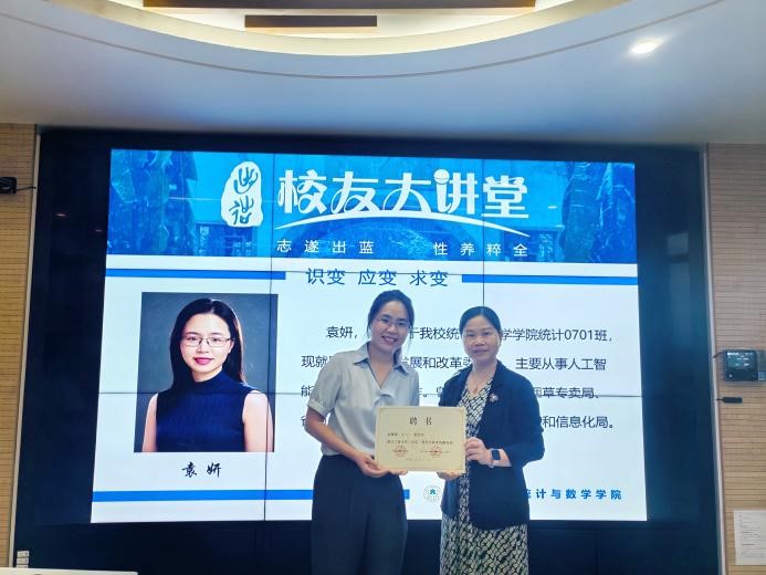 2025年9月13日下午,香港三级片 邀请就职于浙江省发展和改革委员会、统计0701班校友袁妍担任“出蓝”校友大讲堂主讲人。香港三级片 党委书记陈钰芬、香港三级片 党委副书记沈绍伟以及23级、24级本科生代表参加讲座。