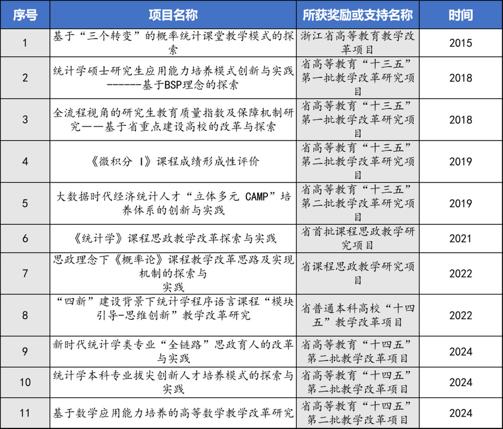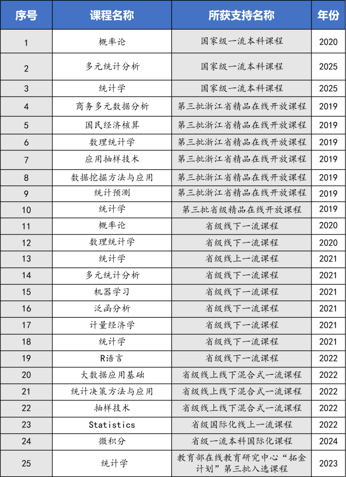 (2)对标一流,持续开展课程建设。以金课为标准,全面开展课程建设。全面更新专业人才培养方案,梳理专业课程教学大纲,探索“课程负责人+教学团队制度”,每年实施“20%三更新制度”(课程案例更新、课件更新和实践内容更新)。建设各类省级以上一流课程18门,其中《概率论》、《统计学》、《多元统计学》为国家级一流本科课程。积极推进在线课程建设,在中国慕课、智慧树等平台累计建设在线课程13门,其中6门入选浙江省在线精品课程,《统计学》入选教育部在线教育研究中心“拓金计划”第三批课程。