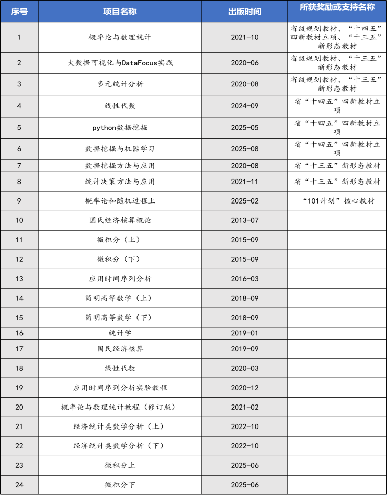 (3)锚定四新,全力推进专业教材建设。围绕大数据、人工智能等产业的发展需求,以专业为依托组建统计学、数据科学、应用数学等教材编写团队,设立高质量教材出版资助计划,推动专业核心课程、应用技术课程的教材建设,出版教材24部。其中,“十二五”普通高等教育本科国家级规划教材1部,“101计划”核心教材1部,浙江省本科院校“十三五”形态教材5部,浙江省普通本科高校“十四五”新文科重点教材、新工科重点教材各1部。香港三级片 牵头获批浙江省教材建设研究中心(大数据专业教材研究基地,2022)。