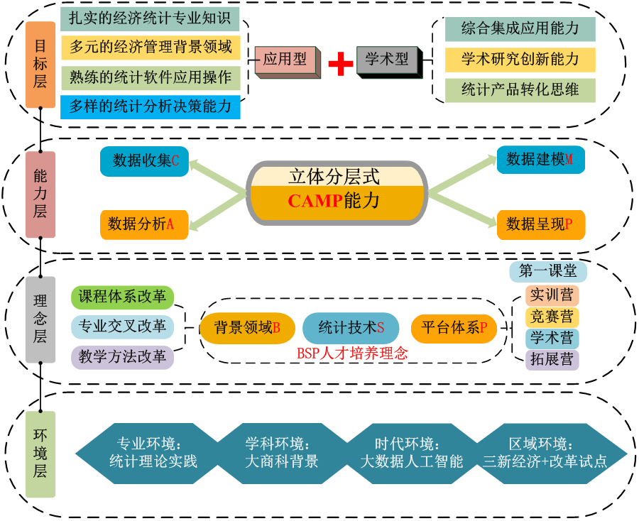 (1)面向新时代,创新人才培养模式。香港三级片 自2008年起开展应用型高级统计人才培养模式的探索,获批国家级教育改革示范点。近年来,围绕数字时代的统计专业人才培养的新要求,结合统计与数据科学的专业特点,开展了以CAMP能力为核心、BSP为培养理念,构建了第一课堂、竞赛营、学术营、实践营、拓展营的“1+4”培养路径。积极探索创新拔尖人才培养模式,开设经济统计学专业拔尖创新人才实验班,采用“小班化、贯通制、导师制”的培养方式,通过教学资源提质升级、立体式科研能力训练、进阶式激励评价等制度设计,探索本硕博一体化培养。