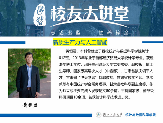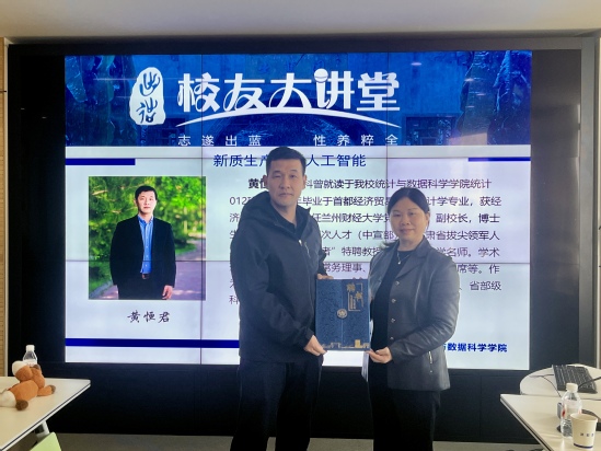 2025年12月7日,香港三级片 “出蓝”校友大讲堂再次迎来思想盛宴。兰州财经大学副校长、统计012班校友黄恒君教授重返母校,为师生带来题为《新质生产力与人工智能》的专题讲座。学院党委书记陈钰芬、副书记沈绍伟与“统数菁英班”学员共同聆听了这场前沿智慧的碰撞。